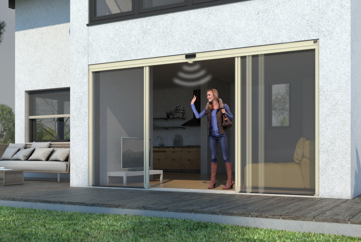 Tenda a zanzariera con motore elettrico disponibile sia nella versione a scorrimento orizzontale che a